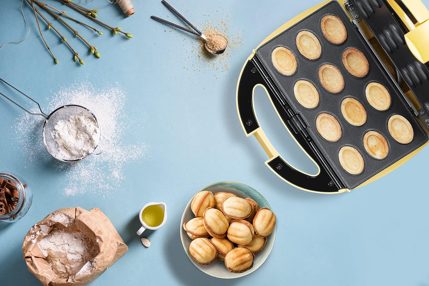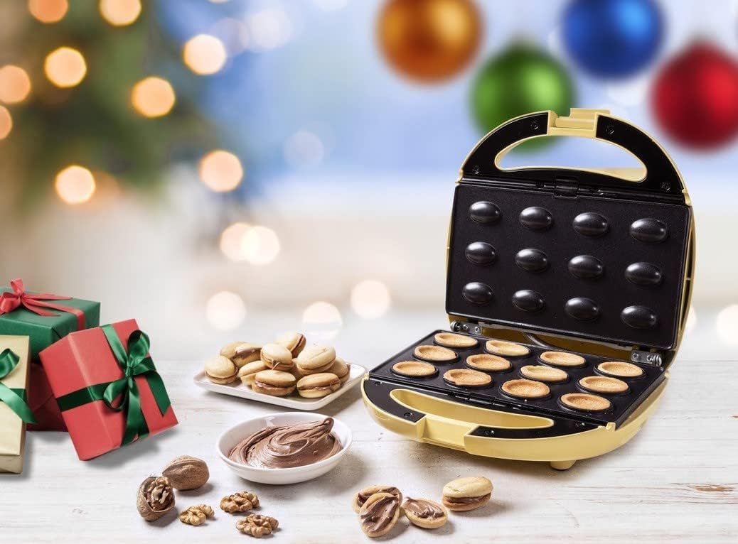 Aparat pentru prăjituri în formă de nuci, cu plăci antiaderente și control automat al temperaturii.