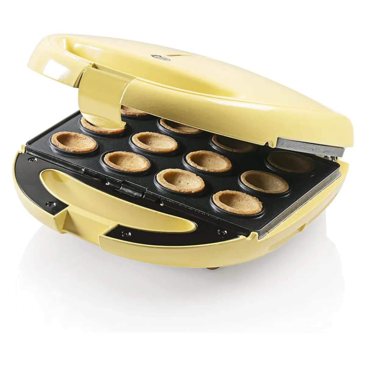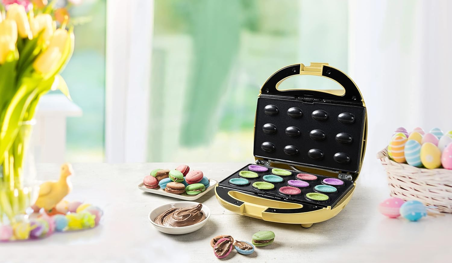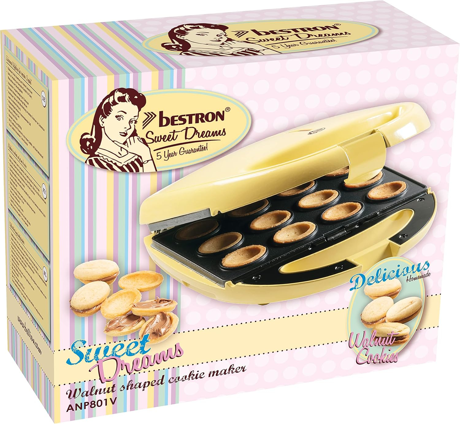 Aparatul de prăjituri Bestron este conceput pentru prepararea prăjiturilor în formă de nuci, ideale pentru umpluturi dulci sau sărate. Permite coacere uniformă datorită controlului automat al temperaturii. Se încălzește rapid și menține temperatura constantă pe toată durata utilizării. Plăcile cu strat antiaderent asigură desprinderea ușoară a prăjiturilor și curățare simplă. Carcasa rezistentă la căldură și mânerul termoizolant oferă siguranță în utilizare. Designul compact permite depozitarea verticală și economisește spațiu în bucătărie.