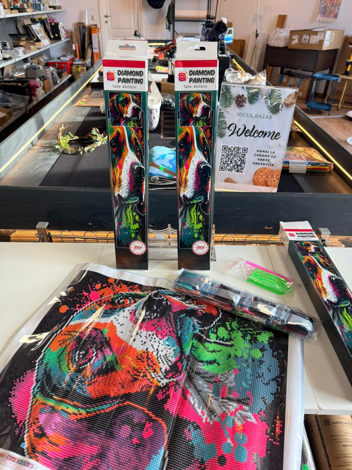 Tablou Diamond Painting cu câine, dimensiune 40 x 50 cm, kit complet pentru relaxare și decor.