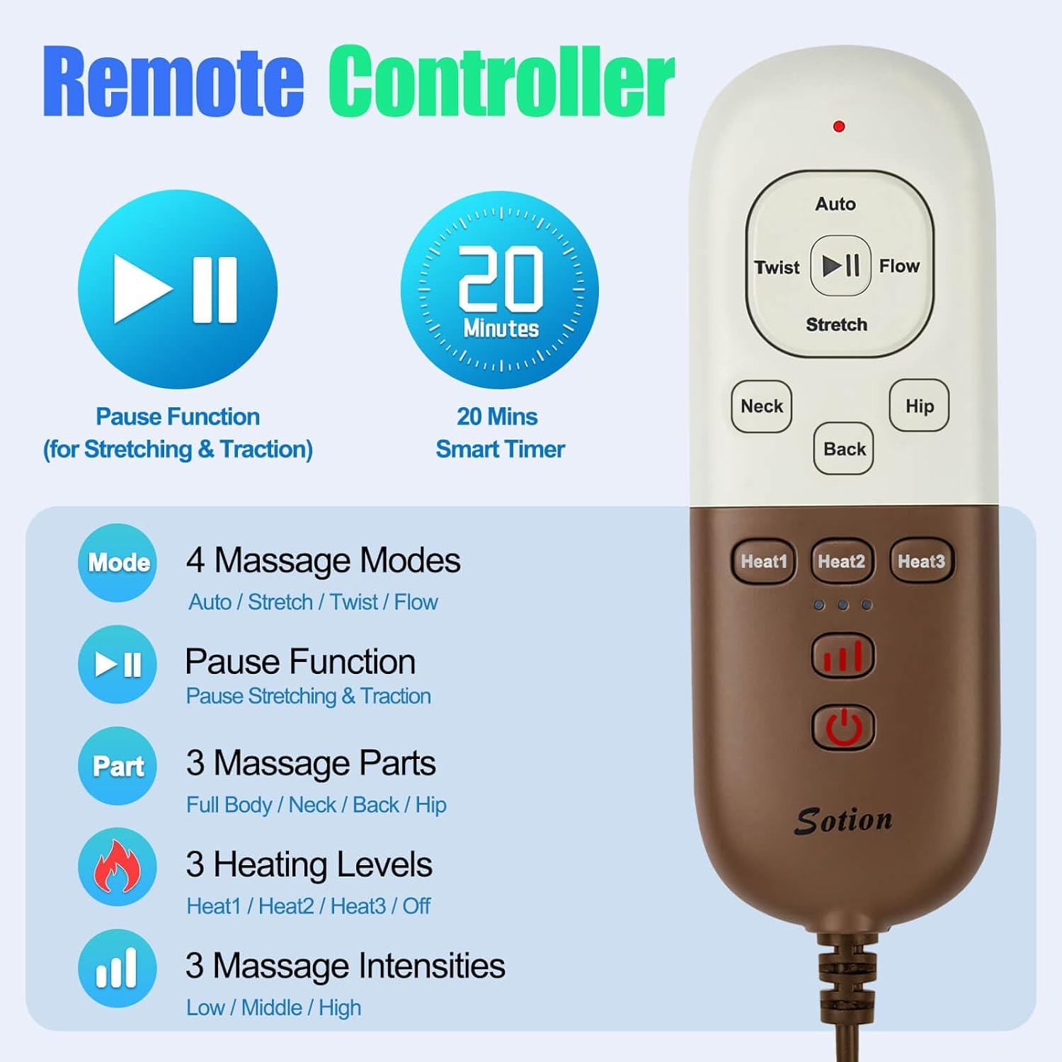 Salteaua este realizată din piele PU premium, oferind o senzație plăcută la atingere și fiind extrem de ușor de întreținut. Este dotată cu 4 moduri de programare (Automat, Întindere, Răsucire și Flux) și 3 niveluri de intensitate, permițându-vă să personalizați experiența în funcție de nevoile dumneavoastră. Mai mult, funcția de încălzire a spatelui dispune de 3 niveluri de temperatură (46.1°C, 54.4°C și 65.0°C), ideală pentru relaxarea profundă a mușchilor tensionați.