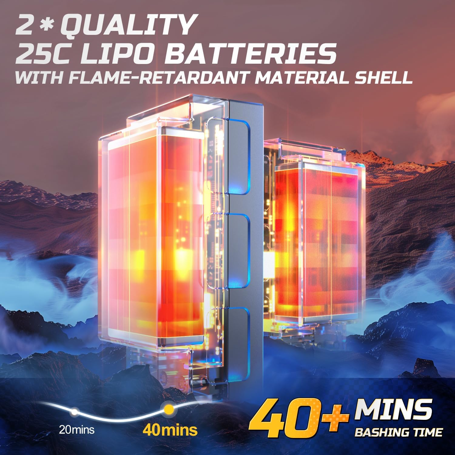 Setul include două baterii Li-Po reîncărcabile. Autonomia totală poate depăși 40 minute de utilizare. Caroseria din plastic ABS rezistent și designul monster truck oferă protecție bună componentelor interne și stabilitate în timpul utilizării intense.