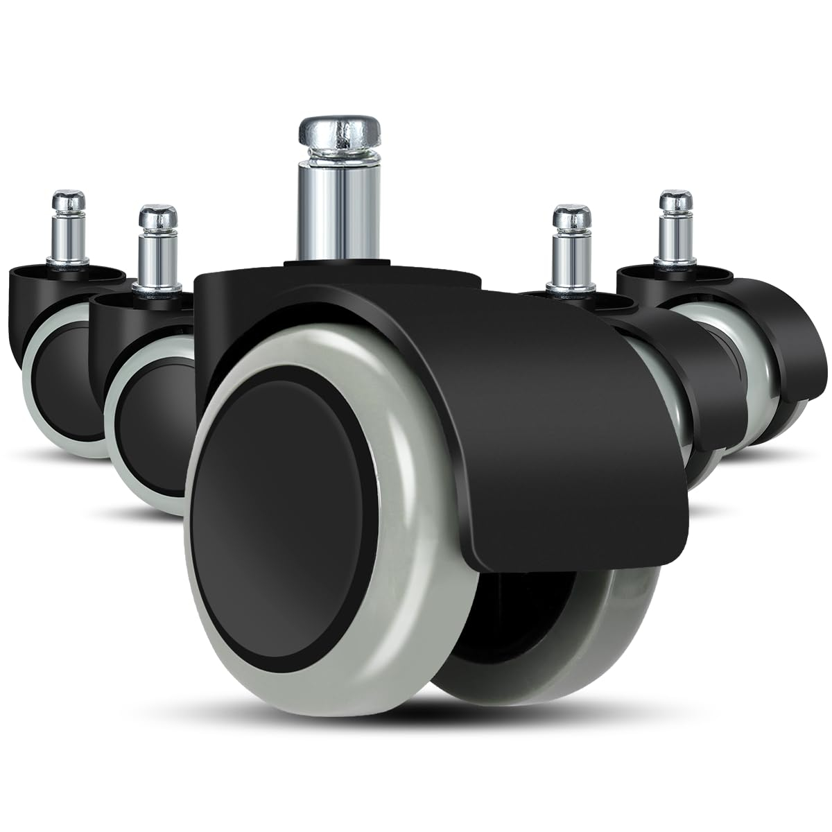 Set de roți pivotante de schimb pentru scaune de birou, concepute special pentru utilizarea pe podele dure precum parchet, laminat, gresie, piatră sau vinil. Roțile sunt fabricate din materiale rezistente la uzură și sunt acoperite cu poliuretan de înaltă calitate, care protejează suprafața podelei și previne zgârieturile sau urmele. Sistemul cu roți duble oferă stabilitate crescută și o alunecare lină și silențioasă, ideală pentru birou sau utilizare acasă.
