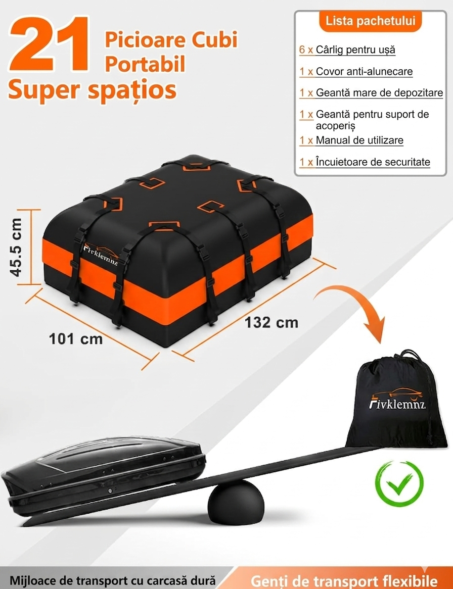 Geantă portbagaj plafon auto FIVKLEMNZ 21 cu ft, impermeabilă, cu 10 curele de fixare, covoraș antiderapant și montare pe orice vehicul cu sau fără bare de plafon.
